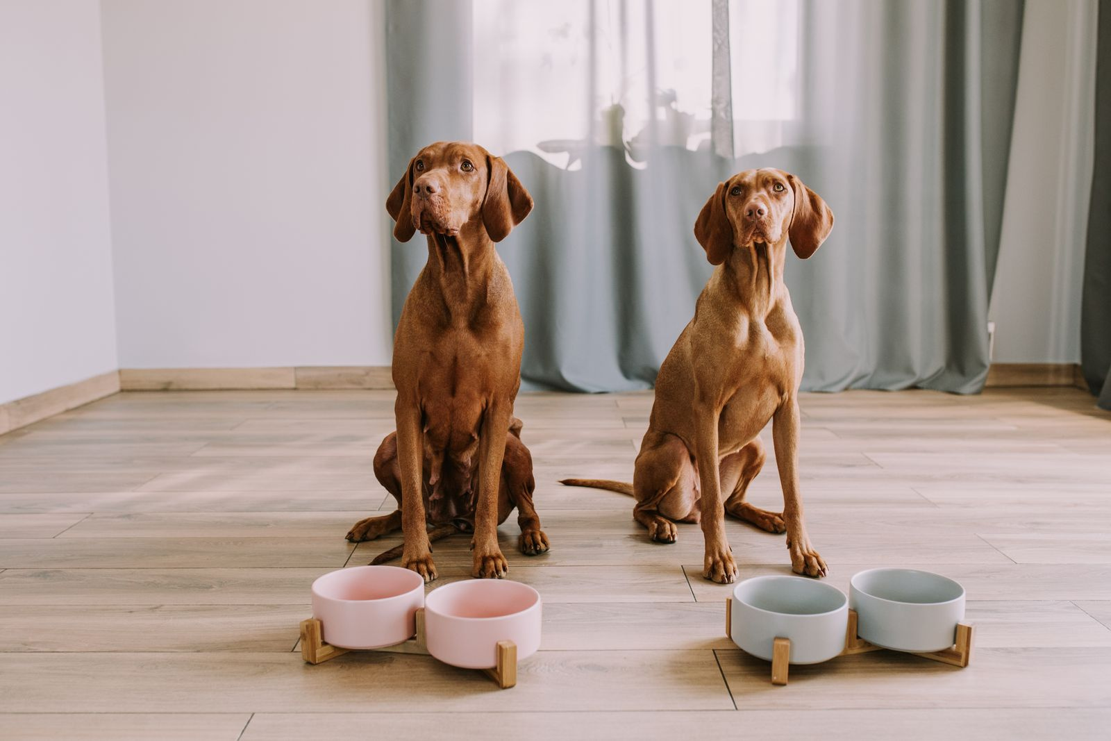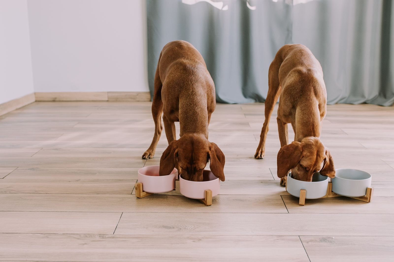 2 ceramiczne miski umiejscowione stabilnej podstawie z naturalnego drewna, bez ołowiu i kadmu.