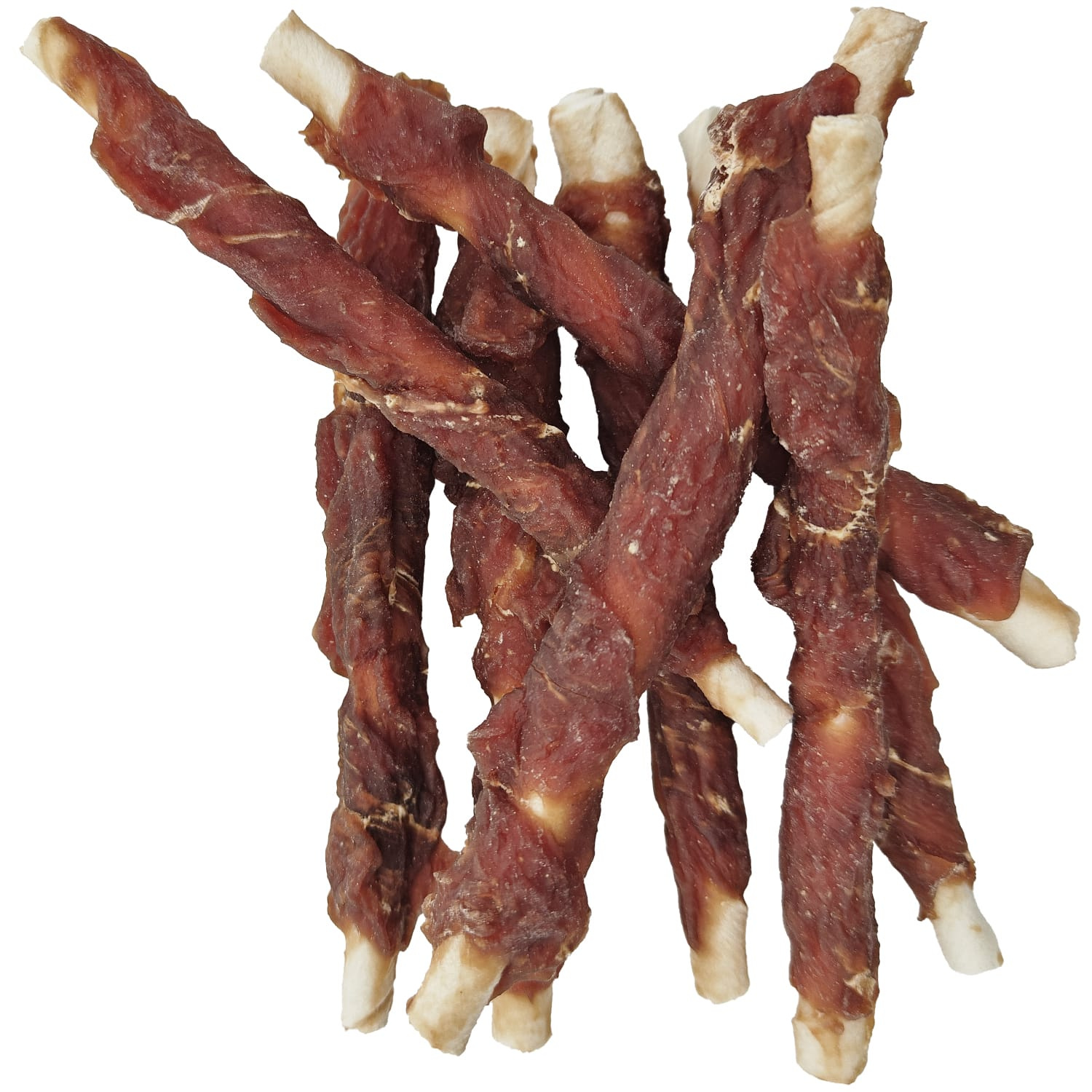 W przysmakach MERSJO nie stosuje się żadnych klejów ani chemicznych spoiw. Mięso jest owijane maszynowo wokół naturalnej, surowej skóry, a następnie utrwalane poprzez suszenie. Proces ten pozwala zachować kształt i trwałość bez potrzeby użycia kleju!