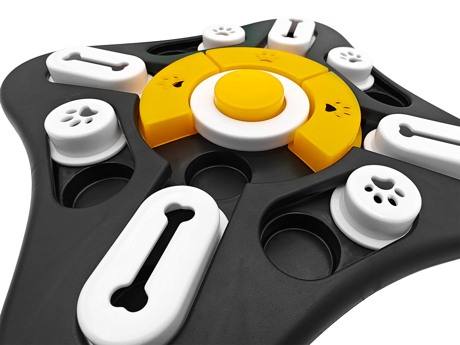 Ruchome elementy obracają się, a środkowy przycisk wydaje dźwięk. Dzięki temu pies uczy się logicznego myślenia, rozwija swoje zmysły i ma frajdę z odkrywania kolejnych przegródek z karmą lub przysmakami.